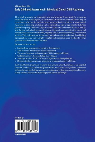 Included in the coverage:Collaboration in school and child care settings. Anxiety disorders, PTSD, OCD, and depression in young children. Sleeping, feeding/eating, and attachment problems in early childhood. Early Childhood Assessment in School and Clinical Child Psychology is an essential resource for clinicians and related professionals, researchers, and graduate students in child and school psychology; assessment, testing, and evaluation; occupational therapy; family studies, educational psychology; and speech pathology.
