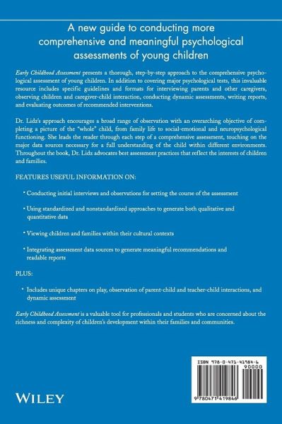 A new guide to conducting more comprehensive and meaningful psychological assessments of young children Early Childhood Assessment presents a thorough, step-by-step approach to the comprehensive psychological assessment of young children. In addition to covering major psychological tests, this invaluable resource includes specific guidelines and formats for interviewing parents and other caregivers, observing children and caregiver-child interaction, conducting dynamic assessments, writing reports, and evaluating outcomes of recommended interventions. Dr. Lidz's approach encourages a broad range of observation with an overarching objective of completing a picture of the "whole" child, from family life to social-emotional and neuropsychological functioning. She leads the reader through each step of a comprehensive assessment, touching on the major data sources necessary for a full understanding of the child within different environments. Throughout the book, Dr. Lidz advocates best assessment practices that reflect the interests of children and families. Features useful information on: * Conducting initial interviews and observations for setting the course of the assessment * Using standardized and nonstandardized approaches to generate both qualitative and quantitative data * Viewing children and families within their cultural contexts * Integrating assessment data sources to generate meaningful recommendations and readable reports Plus: * Includes unique chapters on play, observation of parent-child and teacher-child interactions, and dynamic assessment Early Childhood Assessment is a valuable tool for professionals and students who are concerned about the richness and complexity of children's development within their families and communities.