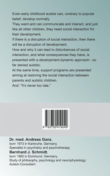Even early childhood autists can, contrary to popular belief, develop normally.They want and can communicate and interact, and just like all other children, they need social interaction for their development.If there is a disruption of social interaction, then there will be a disruption of development.How and why it can lead to disturbances of social interaction, and what consequences they have, is presented with a development-dynamic approach - so far denied autistic.At the same time, support programs are presented aiming at restoring the social interaction between parents and autistic children.And: "It's never too late."