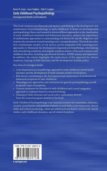 Key areas of coverage include: A developmental psychopathology approach to early childhood mental health disorders and the development of multi-domain models of risk factors.Risk factors contributing to the development and maintenance of emotional and behavioral symptoms in early childhood.Transdiagnostic approaches and risk factors for general psychopathology as well as specific types of symptoms.Current treatments for disorders in early childhood and a novel integrative approach to treatment based on research findings.Training of child clinicians and social policy implications derived from the research program detailed in the book. Early Childhood Psychopathology is an essential resource for researchers, clinicians, scientist-practitioners, and graduate students in such fields as developmental, clinical child, and school psychology, child and adolescent psychiatry, social work, family studies, early childhood education, and all related disciplines.