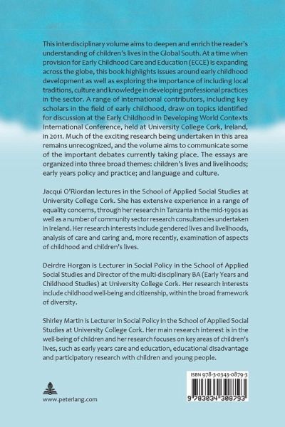 This interdisciplinary volume aims to deepen and enrich the reader's understanding of children's lives in the Global South. At a time when provision for Early Childhood Care and Education (ECCE) is expanding across the globe, this book highlights issues around early childhood development as well as exploring the importance of including local traditions, culture and knowledge in developing professional practices in the sector. A range of international contributors, including key scholars in the field of early childhood, draw on topics identified for discussion at the Early Childhood in Developing World Contexts International Conference, held at University College Cork, Ireland, in 2011. Much of the exciting research being undertaken in this area remains unrecognized, and the volume aims to communicate some of the important debates currently taking place. The essays are organized into three broad themes: children's lives and livelihoods; early years policy and practice; and language and culture.