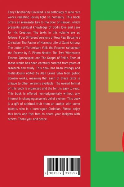 Early Christianity Unveiled is an anthology of nine rare works radiating loving light to humanity. This book offers an elemental key to the door of Heaven, which presents spiritual knowledge of God's love and care for His Creation. The texts in this volume are as follows: Four Different Versions of How Paul Became a Christian; The Pastor of Hermas; Life of Saint Antony; The Letter of Yeremiyah; Valis the Essene; Yahushuah the Essene by E. Planta Nesbit; The Two Witnesses; Essene Apocalypse; and The Gospel of Philip. Each of these works has been carefully curated from years of research and study. This book has been lovingly and meticulously edited by Alan Lewis Silva from public domain works, meaning that each of these texts is unique to other versions available. The overall format of this book is organized and the font is easy to read. This book is offered non-judgmentally without any interest in changing anyone's belief system. This book is a gift of spiritual fruit from an author with some talents, who is a born-again Christian. Please enjoy this book and feel free to share your insights with others. Thank you, and peace.