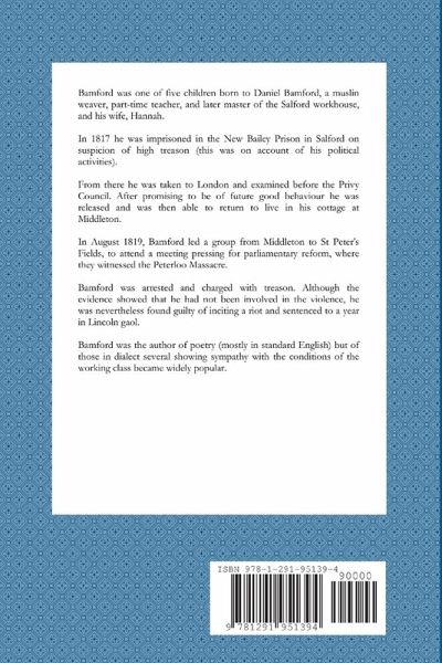 Volume 1 of Samuel Bamford's autobiography. Samuel Bamford (28 February 1788 - 13 April 1872, was an English radical and writer, who was born in Middleton, Lancashire. In August 1819, Bamford led a group from Middleton to St Peter's Fields, to attend a meeting pressing for parliamentary reform, where they witnessed the Peterloo Massacre. Bamford was arrested and charged with treason. Although the evidence showed that he had not been involved in the violence, he was nevertheless found guilty of inciting a riot and sentenced to a year in Lincoln gaol. The experience of the massacre made a deep impression on Bamford, and convinced him that the state's power would always succeed against radical militancy. He came to be seen as a voice for radical reform, but opposed to any activism that involved physical force. Bamford was the author of poetry (mostly in standard English)but of those in dialect several showing sympathy with the conditions of the working class became widely popular.