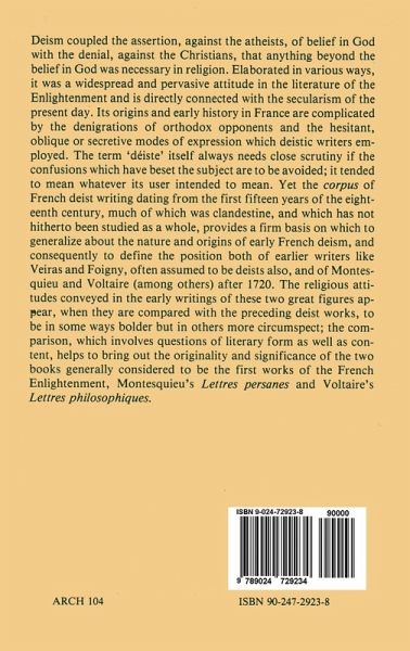I. Prehistory, from 1564 to about 1670.- 1. Introductory; Pierre Viret's 'déistes' at Lyon, and two characters in Bodin.- 2. The 1620s: Mersenne and the 'poème des déistes'.- 3. The absence of deistic ideas from 1630 to 1670.- II. The later seventeenth century: precursors and definitions, from Saint-Evremond to Bayle.- 4. Saint-Evremond and the decline of fideism.- 5. The Utopian religions of Foigny and Veiras.- 6. Definitions and accusations, 1670-1700; 'deism' as a term of opprobrium.- 7. The Turkish Spy.- III. The first French deists, 1700-1715.- 8. Gilbert's Calejava: rational deism with Protestant overtones.- 9. Lahontan and Gueudeville: natural religion from Canada.- 10. The anti-Christian deism of the Militaire philosophe.- 11. The Examen de la religion and other clandestine works.- 12. Tyssot de Patot: types of deism and religious criticism.- IV. Deistic ideas in the early works of Montesquieu and Voltaire.- 13. Montesquieu: Lettres persanes.- 14. Voltaire: Lettres philosophiques.- 15. Conclusions.- Biography.- Literary allusions.- Religious attitudes.- Bibliography: 1. Manuscripts and published works discussed in the text as examples or precursors of deism.- 2. Editions, used for reference, of works by major authors.- 3. Secondary authorities, cited in the notes or of general interest for the subject; excluding works cited in the Appendix.