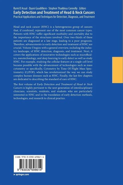 Early Detection, Diagnosis, and Treatment of Head and Neck Cancers.- Emerging Technologies in Head & Neck Cancer Detection: Industry landscape of Head and Neck Cancer Detection and Diagnosis.- Microfluidic Technologies for Head and Neck Cancer: from Single Cell Analysis to Tumor-on-a-chip.- Nanotechnology for Diagnosis Imaging and Treatment of Head & Neck Cancers.- The Role of Mass Cytometry in Early Detection, Diagnosis, and Treatment of Head and Neck Cancers.- Deep Learning based Cancer Detection from H&E Slide of HPV-associated Oropharyngeal Tumors.- Salivary Biomarkers for Non-invasive Early Detection of Head and Neck Cancer.- Surgical Ablative Treatment of Head and Neck Cancer.- Conventional Reconstructive Approaches following Resection of Head and Neck Cancers.- Dental Implants and their Management in the Treatment of Oral Cancers.