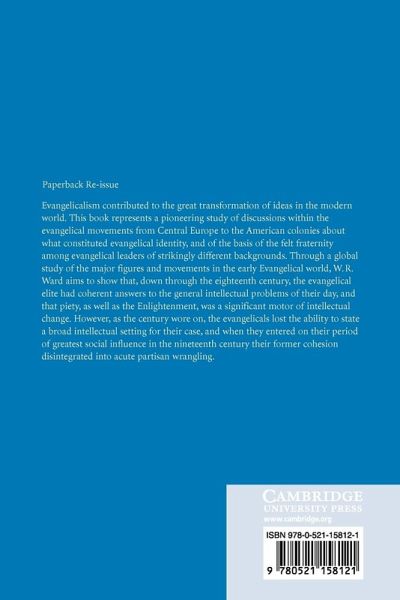 Evangelicalism contributed to the great transformation of ideas in the modern world. This book represents a pioneering study of discussions within the evangelical movements from Central Europe to the American colonies about what constituted evangelical identity and of the basis of the fraternity among evangelical leaders of strikingly different backgrounds. Through a global study of the major figures and movements in the early evangelical world, W. R. Ward aims to show that down through the eighteenth century the evangelical elite had coherent answers to the general intellectual problems of their day and that piety as well as the enlightenment was a significant motor of intellectual change. However, as the century wore on the evangelicals lost the ability to state a broad intellectual setting for their case, and when they entered on their period of greatest social influence in the nineteenth century their former cohesion disintegrated into acute partisan wrangling.