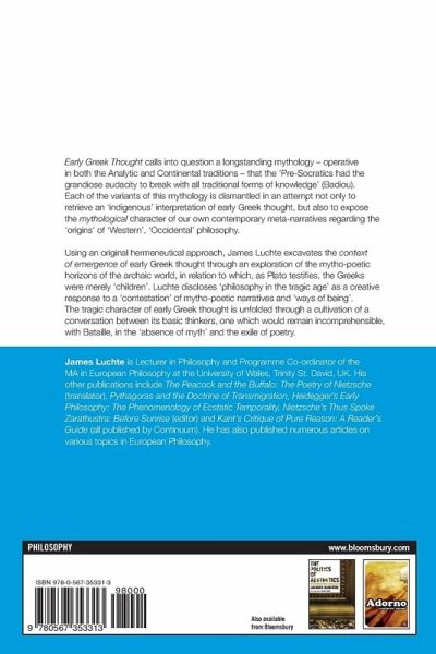 Early Greek Thought calls into question a longstanding mythology - operative in both the Analytic and Continental traditions - that the 'Pre-Socratics had the grandiose audacity to break with all traditional forms of knowledge' (Badiou). Each of the variants of this mythology is dismantled in an attempt to not only retrieve an 'indigenous' interpretation of early Greek thought, but also to expose the mythological character of our own contemporary meta-narratives regarding the 'origins' of 'Western', 'Occidental' philosophy. Using an original hermeneutical approach, James Luchte excavates the context of emergence of early Greek thought through an exploration of the mytho-poetic horizons of the archaic world, in relation to which, as Plato testifies, the Greeks were merely 'children'. Luchte discloses 'philosophy in the tragic age' as a creative response to a 'contestation' of mytho-poetic narratives and 'ways of being'. The tragic character of early Greek thought is unfolded through a cultivation of a conversation between its basic thinkers, one which would remain incomprehensible, with Bataille, in the 'absence of myth' and the exile of poetry.