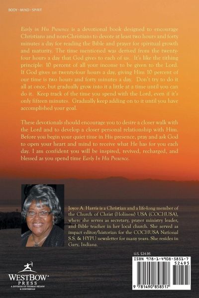 Early in His Presence is a devotional book designed to encourage Christians and non-Christians to devote at least two hours and forty minutes a day for reading the Bible and prayer for spiritual growth and maturity. The time mentioned was derived from the twenty-four hours a day that God gives to each of us. It's like the tithing principle: 10 percent of all your income to be given to the Lord. If God gives us twenty-four hours a day, giving Him 10 percent of our time is two hours and forty minutes a day. Don't try to do it all at once, but gradually grow into it a little at a time until you can do it. Keep track of the time you spend with the Lord, even if it's only fifteen minutes. Gradually keep adding on to it until you have accomplished your goal. These devotionals should encourage you to desire a closer walk with the Lord and to develop a closer personal relationship with Him. Before you begin your quiet time in His presence, pray and ask God to open your heart and mind to receive what He has for you each day. I am confident you will be inspired, revived, recharged, and blessed as you spend time Early In His Presence.
