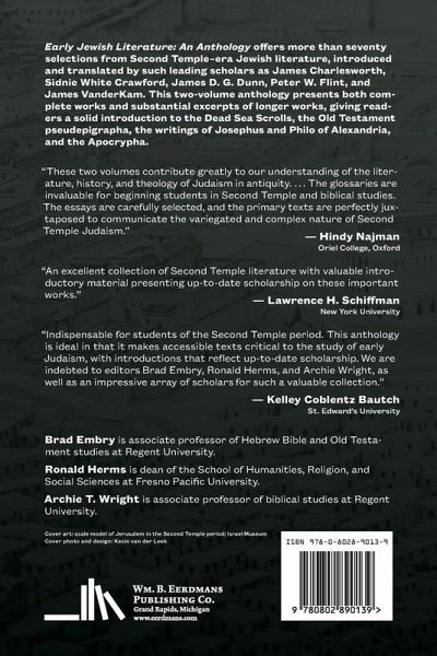 Early Jewish Literature: An Anthology offers more than seventy selections from Second Temple-era Jewish literature, each introduced and translated by a leading scholar in the field. Organized by genre, this two-volume anthology presents both complete works and substantial excerpts of longer works, giving readers a solid introduction to the major works of the era—the Dead Sea Scrolls, the Old Testament Pseudepigrapha, the writings of Josephus and Philo of Alexandria, and the Septuagint (Apocrypha). The substantive introduction to each selection includes these elements: narrative description; author/provenance; date/occasion; text, language, sources, and transmission; theology; and reception during the Second Temple period. Additional student aids include a list of further readings on each selection, a section of maps, a glossary of biographical names, and a glossary of terms. With contributors and translators including such noted scholars as James Charlesworth, Sidnie White Crawford, James D. G. Dunn, Peter W. Flint, and James VanderKam, this anthology will be an essential resource for all students of early Jewish literature and emerging Christian traditions.