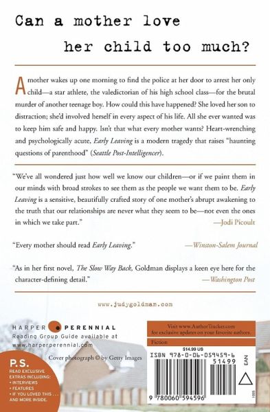 A mother wakes one morning to find the police at her door to arrest her only child-a star athlete and honor student-for murder. The Smallwoods are one of those families who project a rosy image, exactly what we all hoped and imagined our lives would be. Peter Smallwood is a patent attorney with the oldest firm in town. Kathryne is president of parents' council at the private high school their son, Early, attends. She is an over-involved mother; Peter is under-involved. She's excessive when she should hold back; he's stingy when fullness is needed. Kathryne is so protective of their son, so overbearing, that the only way out for him is to disappoint her in a profound way. The novel opens the night before his sentencing. It covers the next thirteen months and flashes back to family memories Kathryne has told again and again through the years, trotting them out like scrubbed children-as well as the memories she would just as soon forget. EARLY LEAVING is Kathryne's story. She probes the pieces of the past to see if she should have seen the end coming. Was there any point where she might have come between her son and what lay in wait for him? Or was it just the randomness of fate and its consequences? Was she the cause? All she ever wanted was to keep him safe and happy. Isn't that what every mother wants?