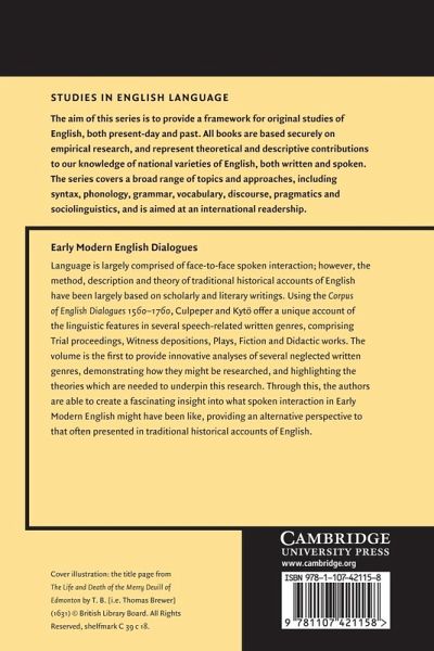 Language is largely comprised of face-to-face spoken interaction; however, the method, description and theory of traditional historical accounts of English have been largely based on scholarly and literary writings. Using the Corpus of English Dialogues 1560-1760, in this book Culpeper and Kytö offer a unique account of the linguistic features in several speech-related written genres, comprising trial proceedings, witness depositions, plays, fiction and didactic works. The volume is the first to provide innovative analyses of several neglected written genres, demonstrating how they might be researched, and highlighting the theories which are needed to underpin this research. Through this, the authors are able to create a fascinating insight into what spoken interaction in Early Modern English might have been like, providing an alternative perspective to that often presented in traditional historical accounts of English.