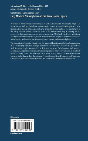 Introduction: Renaissance and Early Modern Philosophy: Mobile Frontiers and Established Outposts.- Section I: The Endurance of Tradition.- 1. What's Wrong with Doing History of Renaissance Philosophy? Rudolph Goclenius and the Canon of Early Modern Philosophy.- 2. Italian Renaissance Love Theory and the General Scholar in the Seventeenth Century.- 3. The Critique of Scholastic Language in Renaissance Humanism and Early Modern Philosophy.- 4. Henry More and Girolamo Cardano.- Section II: Natural Philosophy.- 5.From Attraction and Impulsus to Motion of Liberty. Rarefaction and Condensation, Nature and Violence in Cardano, Francis Bacon, Glisson and Hale.- 6. Telesio Among the Novatores: Telesio's Reception in the Seventeenth Century.- 7. Looking at an Earth-Like Moon and living on a Moon-Like Earth in Renaissance and Early Modern Thought. Section III: Changing Conceptions of the Human.- 8. Descartes, the Humanists and the Perfection of Man.- 9. The Return of Campanella:La Forge versus Cureau de la Chambre.- 10. From Animal Happiness to Human Unhappiness: Cardano, Vanini, Theophrastus redivivus (1659). Section IV: Moral and Political Theory.- 11. Ethics, Politics, and Friendship in Bacon's Essays (1625): Between Past and Future.- 12. Thomas Hobbes Against the Aristotelian Account of the Virtues and his Renaissance Source Lorenzo Valla.- 13. Debating "Greatness" from Machiavelli to Burton.- 14. John Upton from Political Liberty to Critical Liberty: The Moral and Political Implications of Ancient and Renaissance Studies in the Enlightenment.- 15. Epilogue: A Story in the History of Scholarship: The Rediscovery of Tommaso Campanella.