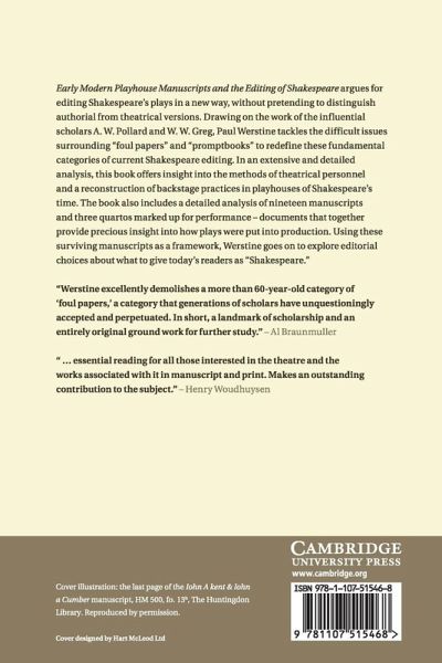 Early Modern Playhouse Manuscripts and the Editing of Shakespeare argues for editing Shakespeare's plays in a new way, without pretending to distinguish authorial from theatrical versions. Drawing on the work of the influential scholars A. W. Pollard and W. W. Greg, Werstine tackles the difficult issues surrounding 'foul papers' and 'promptbooks' to redefine these fundamental categories of current Shakespeare editing. In an extensive and detailed analysis, this book offers insight into the methods of theatrical personnel and a reconstruction of backstage practices in playhouses of Shakespeare's time. The book also includes a detailed analysis of nineteen manuscripts and three quartos marked up for performance - documents that together provide precious insight into how plays were put into production. Using these surviving manuscripts as a framework, Werstine goes on to explore editorial choices about what to give today's readers as 'Shakespeare'.