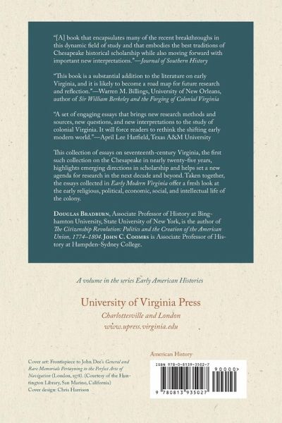 This collection of essays on seventeenth-century Virginia, the first such collection on the Chesapeake in nearly twenty-five years, highlights emerging directions in scholarship and helps set a new agenda for research in the next decade and beyond. The contributors represent some of the best of a younger generation of scholars who are building on, but also criticizing and moving beyond, the work of the so-called Chesapeake School of social history that dominated the historiography of the region in the 1970s and 1980s. Employing a variety of methodologies, analytical strategies, and types of evidence, these essays explore a wide range of topics and offer a fresh look at the early religious, political, economic, social, and intellectual life of the colony. Contributors: Douglas Bradburn, Binghamton University, State University of New York * John C. Coombs, Hampden-Sydney College * Victor Enthoven, Netherlands Defense Academy * Alexander B. Haskell, University of California Riverside * Wim Klooster, Clark University * Philip Levy, University of South Florida * Philip D. Morgan, Johns Hopkins University * William A. Pettigrew, University of Kent * Edward DuBois Ragan, Valentine Richmond History Center * Terri L. Snyder, California State University, Fullerton * Camilla Townsend, Rutgers University * Lorena S. Walsh, Colonial Williamsburg Foundation