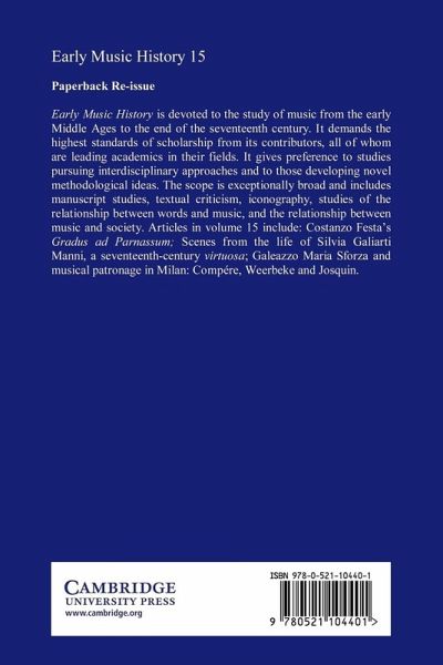 Early Music History is devoted to the study of music from the early Middle Ages to the end of the seventeenth century. It demands the highest standards of scholarship from its contributors, all of whom are leading academics in their fields. It gives preference to studies pursuing interdisciplinary approaches and to those developing novel methodological ideas. The scope is exceptionally broad and includes manuscript studies, textual criticism, iconography, studies of the relationship between words and music and the relationship between music and society. Articles in volume fifteen include: Costanzo Festa's Gradus ad Parnassum; Scenes from the life of Silvia Galiarti Manni, a seventeenth-century virtuosa; Galeazzo Maria Sforza and musical patronage in Milan: Compere, Weerbeke and Josquin.