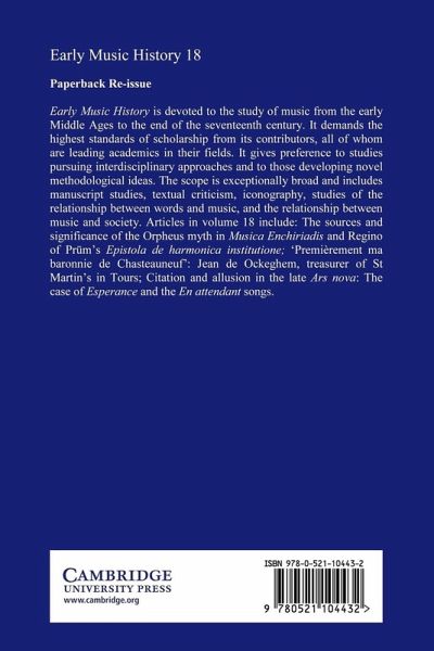 Early Music History is devoted to the study of music from the early Middle Ages to the end of the seventeenth century. It demands the highest standards of scholarship from its contributors, all of whom are leading academics in their fields. It gives preference to studies pursuing interdisciplinary approaches and to those developing novel methodological ideas. The scope is exceptionally broad and includes manuscript studies, textual criticism, iconography, studies of the relationship between words and music and the relationship between music and society. Articles in volume eighteen include: The sources and significance of the Orpheus myth in Musica Enchiriadis and Regino of Prum's Epistola de harmonica institutione; 'Premierement ma baronnie de Chasteauneuf': Jean de Ockeghem, treasurer of St Martin's in Tours; Citation and allusion in the late Ars nova: the case of Esperance and the En attendant songs.