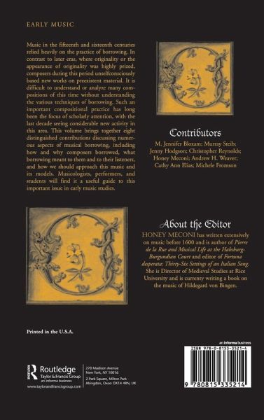 A timely addition to Routledge's Criticism and Analysis of Early Music series, this collection of essays examines the common compositional practice of borrowing or imitation in fifteenth-and sixteenth-century music, addressing how and why borrowing was used, the significance of borrowing, the techniques of borrowing, and its recognizable features. The book provides a broad overview of this common practice and sheds light on previously unexplored aspects of early musical borrowing. It functions as both an introduction to the subject as well as a guide for further research. The contributors, all highly regarded in their field, offer new insights that will change the way we view borrowing.