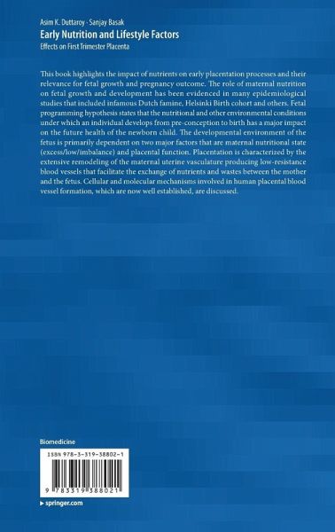 This book highlights the impact of nutrients on early placentation processes and their relevance for fetal growth and pregnancy outcome. The role of maternal nutrition on fetal growth and development has been evidenced in many epidemiological studies that included infamous Dutch famine, Helsinki Birth cohort and others. Fetal programming hypothesis states that the nutritional and other environmental conditions under which an individual develops from pre-conception to birth has a major impact on the future health of the newborn child. The developmental environment of the fetus is primarily dependent on two major factors that are maternal nutritional state (excess/low/imbalance) and placental function. Placentation is characterized by the extensive remodeling of the maternal uterine vasculature producing low-resistance blood vessels that facilitate the exchange of nutrients and wastes between the mother and the fetus. Cellular and molecular mechanisms involved in human placental blood vessel formation, which are now well established, are discussed.