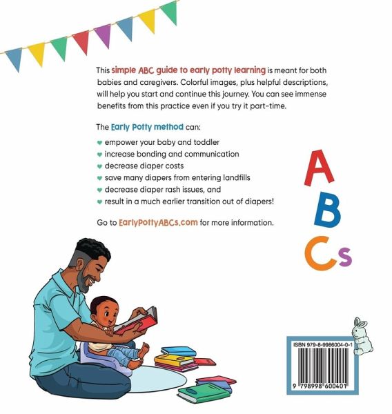 Discover a gentle, natural approach to early pottying with your baby, made simple and fun. This colorful and engaging ABC book introduces easy to follow steps to help you start early pottying (also known as elimination communication or "EC"). With a few practical tips, you'll feel empowered to begin today. The 'Early Potty' method is a return to our roots. Long before disposable diapers became the norm in the mid-20th century, parents around the world practiced early pottying, with most children out of diapers by 18 months. This book brings that wisdom back in a way that's accessible and encouraging for modern families. Diaper companies profit from parents waiting. Early pottying reduces wastes, saves money, and strengthens the parent-child bond along the way. Imagine a different way: one where you tune in to your baby's natural rhythms and respond with confidence. By following your little one's cues, you can support potty awareness from the very beginning. As your child grows into a toddler, he or she can gain the ability to walk to the potty. The ideal window to begin early pottying is between birth and 4 months. You can successfully start anytime before 18 months. After that, most families transition to more traditional potty-training methods. Either way, early pottying gives your child a head start and gives you more options. This bright and cheerful ABC book makes it easy to begin. Whether you're new to elimination communication or curious, Early Potty ABCs is the perfect guide to inspire and support your journey. Start today and discover how beneficial early pottying can be!