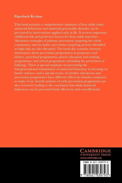 This book presents a comprehensive summary of how well adult crime, antisocial behaviour and antisocial personality disorder can be prevented by interventions applied early in life. It reviews important childhood risk and protective factors for these adult outcomes and the alternative strategies of primary prevention (targeting the whole community) and secondary prevention (targeting persons identified as high risk) are discussed. The book also contains extensive information about prevention programmes in pregnancy and infancy, pre-school programmes, parent education and training programmes, and school programmes (including the prevention of bullying). There is special emphasis on preventing the intergenerational transmission of antisocial behaviour by focusing on family violence, and a special review of whether risk factors and prevention programmes have different effects for females compared to males. Cost-benefit analyses of early prevention programmes are also reviewed, leading to the conclusion that adult antisocial behaviour can be prevented both effectively and cost-efficiently.