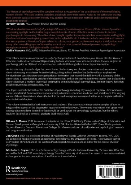 This volume serves as a companion to Early Psychological Research Contributions from Women of Color Volume I (Grahe, Ceynar, & Mason, 2023). It focuses on the dissertations of 20 builders-women of color who earned their doctoral degrees in psychology prior to 1990 and who were builders in the field through her leadership or innovation.
