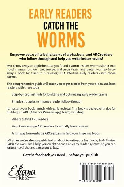 Empower yourself to build teams of alpha, beta, and ARC readers who follow through and help you write better novels! Ever throw away an apple because you found a worm inside? Worms slither into novel manuscripts too ... weaknesses and errors that make readers want to throw away a book (or trash it in reviews)! But effective early readers catch those worms. This comprehensive guide will teach you to get results from your alpha and beta readers with these tools:Practical, step-by-step methods for building and optimizing early reader teams Simple strategies to improve reader follow-through Access to over a dozen editable templates for communicating with alpha and beta readers Jumpstart your book launch with early reviews! This book is packed with tips for building an ARC (Advance Review Copy) team, including:Where to find ARC readers How to encourage ARC readers to actually leave reviews A fun way to incentivize ARC readers to find your lingering typos Whether you're already published or about to write your first book, Early Readers Catch the Worms will help you crack the code on early reader systems so you can write a novel that readers want to buy. Get the feedback you need ... before you publish. Supercharge your alpha, beta, and ARC reader systems by clicking Buy Now at the top of the page!