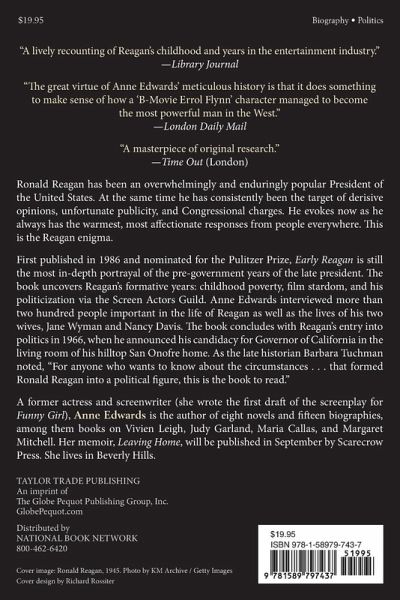 First published in 1986 and nominated for the Pulitzer Prize, Early Reagan is still the most in-depth portrayal of the pre-government years of the late president. The book uncovers Reagan’s formative years: childhood poverty, film stardom, and his politicization via the Screen Actors Guild. Anne Edwards interviewed more than two hundred people important in the life of Reagan as well as those of his two wives, Jane Wyman and Nancy Davis. The book concludes with Reagan’s entry into politics in 1966, when he announced his candidacy for Governor of California in the living room of his hilltop San Onofre home. As the late historian Barbara Tuchman noted, “For anyone who wants to know about the circumstances . . . that formed Ronald Reagan into a political figure, this is the book to read.”
