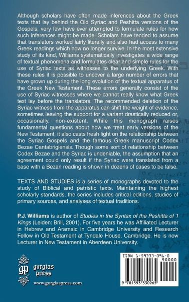 Although scholars have often made inferences about the Greek texts that lay behind the Old Syriac and Peshitta versions of the Gospels, very few have ever attempted to formulate rules for how such inferences might be made. Scholars have tended to assume that translators worked fairly literally and also had access to many Greek readings which now no longer survive. In the most extensive study of its kind, Williams systematically investigates a wide range of textual phenomena and formulates clear and simple rules for the use of Syriac texts as witnesses to the underlying Greek. With these rules it is possible to uncover a large number of errors that have grown up during the long evolution of the textual apparatus of the Greek New Testament. These errors generally consist of the use of Syriac witnesses where we cannot really know what Greek text lay before the translators. The recommended deletion of the Syriac witness from the apparatus can shift the weight of evidence, sometimes leaving the support for a variant drastically reduced or, occasionally, non-existent. While this monograph raises fundamental questions about how we treat early versions of the New Testament, it also casts fresh light on the relationship between the Syriac Gospels and the famous Greek manuscript Codex Bezae Cantabrigiensis. Though some sort of relationship between Codex Bezae and the Syriac is undeniable, the assumption that an agreement could only result if the Syriac were translated from a base with a Bezan reading is shown in dozens of cases to be false. TEXTS AND STUDIES is a series of monographs devoted to the study of Biblical and patristic texts. Maintaining the highest scholarly standards, the series includes critical editions, studies of primary sources, and analyses of textual traditions. P.J. Williams is author of Studies in the Syntax of the Peshitta of 1 Kings (Leiden: Brill, 2001). For five years he was Affiliated Lecturer in Hebrew and Aramaic in Cambridge University and Research Fellow in Old Testament at Tyndale House, Cambridge. He is now Lecturer in New Testament in Aberdeen University.