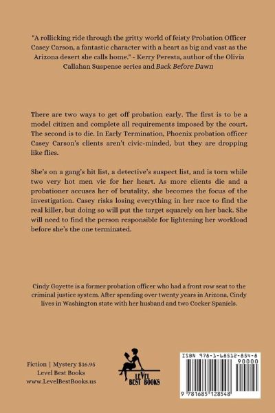 There are two ways to get off probation early. The first is to be a model citizen and complete all requirements imposed by the court. The second is to die. In Early Termination, Phoenix probation officer Casey Carson's clients aren't civic-minded, but they are dropping like flies. She's on a gang's hit list, a detective's suspect list, and is torn while two very hot men vie for her heart. As more clients die and a probationer accuses her of brutality, she becomes the focus of the investigation. Casey risks losing everything in her race to find the real killer, but doing so will put the target squarely on her back. She will need to find the person responsible for lightening her workload before she's the one terminated.