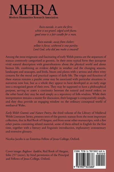Among the most enigmatic and fascinating of early Welsh poems are the sequences of stanzas commonly categorized as gnomic. In their most typical form they juxtapose vivid natural description with generalisations about the physical world and about human life, combining an evident delight in weather and the changing seasons, landscapes and seascapes, and birds, beasts and plants with a serious and often witty concern for the moral and practical aspects of daily life. The origin and function of these stanzas remains a puzzle; some may be associated with particular situations in narratives now lost, but as a whole they appear to have developed at an early stage into a recognised genre of their own. They may be supposed to have a philosophical purpose, serving to assert a continuity between the natural and moral orders; on the other hand they may be read simply as a repository of folk-wisdom. While their interpretation remains a matter for discussion, their language is comparatively simple, and they thus provide an engaging window on the ordinary conceptual world of mediaeval Wales. This volume presents texts of the gnomic stanzas from the most important collection, that in Red Book of Hergest, and from some other manuscripts, with a few other poems containing related material, some of them edited in English for the first time, together with a literary and linguistic introduction, explanatory commentary and extensive glossary. Nicolas Jacobs is an Emeritus Fellow of Jesus College, Oxford.