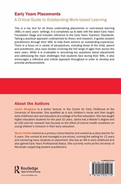 Jackie Musgraveis a Senior Lecturer in the Centre for Early Childhood at the University of Worcester. She qualified as a sick children's nurse and then taught early childhood care and education at a college of Further Education. She has taught Higher Education students for the past 10 years. Jackie has a Masters degree from the University of Sheffield, where her research focused on an aspect of practice-based learning for level 3 students. Her doctorate research examined the effect of chronic health conditions on young children's inclusion in their early education and she has just been awarded her PhD. Nicola Stobbs initially trained as a primary school teacher, and worked as a class teacher for 5 years. She worked at a pre-school and was promoted to the manager's position, running the setting for another 12 years. She has an MA in Early Childhood and also gained Early Years Professional Status. During her time as a setting manager Nicola was a mentor for many students on placement. She is committed to providing excellent care for children and supporting students to become the excellent practitioners that children deserve. She now works at the University of Worcester supporting student practitioners.
