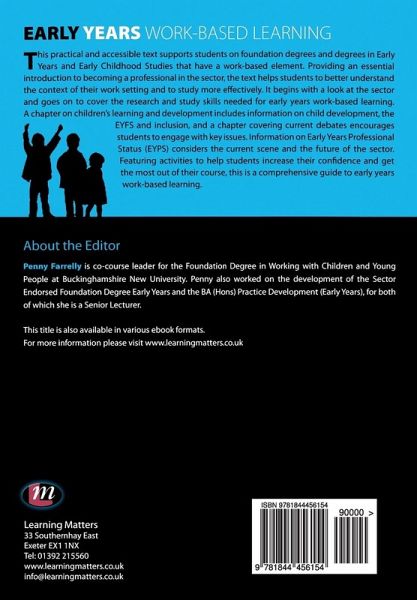 This book supports students on foundation degrees and degrees in Early Years and Early Childhood Studies that have a work-based element. An essential introduction to becoming a professional in the sector, it begins by looking at work-based learning and goes on to cover study, research skills and essential subject knowledge. It includes activities to help students increase their confidence and get the most out of their course. Essential information on Early Years Professional Status (EYPS) considers the current scene and the future of the sector.