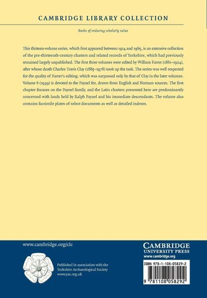 This thirteen-volume series, which first appeared between 1914 and 1965, is an extensive collection of the pre-thirteenth-century charters and related records of Yorkshire, which had previously remained largely unpublished. The first three volumes were edited by William Farrer (1861-1924), after whose death Charles Travis Clay (1885-1978) took up the task. The series was well respected for the quality of Farrer's editing, which was surpassed only by that of Clay in the later volumes. Volume 6 (1939) is devoted to the Paynel fee, drawn from English and Norman sources. The first chapter focuses on the Paynel family, and the Latin charters presented here are predominantly concerned with lands held by Ralph Paynel and his immediate descendants. The volume also contains facsimile plates of select documents as well as detailed indexes.