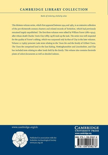 This thirteen-volume series, which first appeared between 1914 and 1965, is an extensive collection of the pre-thirteenth-century charters and related records of Yorkshire, which had previously remained largely unpublished. The first three volumes were edited by William Farrer (1861-1924), after whose death Charles Travis Clay (1885-1978) took up the task. The series was well respected for the quality of Farrer's editing, which was surpassed only by that of Clay in the later volumes. Volume 12 (1965) presents Latin texts relating to the Tison fee and the family of Gilbert Tison. The Tison fee comprised land in the East Riding, Nottinghamshire and Lincolnshire, and Clay has included texts relating to other lands held by the family. This volume also contains facsimile plates of select documents as well as detailed indexes.