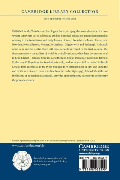 Published for the Yorkshire Archaeological Society in 1903, this second volume of a two-volume survey sets out to collect and put into historical context the extant documentation relating to the foundation and early history of seven Yorkshire schools: Pontefract, Howden, Northallerton, Acaster, Rotherham, Giggleswick and Sedbergh. Although none is as ancient as the three cathedral schools surveyed in the first volume, the documentation - the earliest of which is typically in Latin, while later documents tend to be in English - extends from 1139 and the founding of Pontefract Grammar, takes in Rotherham College from its foundation in 1483, and includes a full record of Sedbergh School, from its genesis in the 1520s through its re-establishment in 1551 and up to the end of the seventeenth century. Arthur Francis Leach (1851-1915), dubbed 'the father of the history of education in England', provides an introductory narrative to accompany these primary sources.