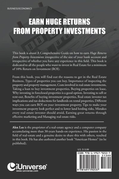 This book is about A Comprehensive Guide on how to earn Huge Returns from Property Investments irrespective of the size of your bank account and irrespective of whether you have any experience in this field. This book is dedicated to all the people who want to invest in Real Estate for a minimum of 10% Return on Investment (ROI). From this book, you will find out the reasons to get in the Real Estate Business, Types of properties you can buy, Importance of inspecting the property and property management, Costs involved in real estate investments, Taking a loan to buy investment properties, Buying properties on lease, Why investing in foreclosed properties is a good option, Investing to sell or rent-out, Benefits of buying investment properties, Real estate investor tax implications and tax deductions for landlords on rental properties, Different ways you can earn ROI on your investment property, Tips to make your investment property look perfect and to lower land lording risks, Mistakes every real estate investor should avoid, Earning great returns through effective marketing and Managing real estate risks.