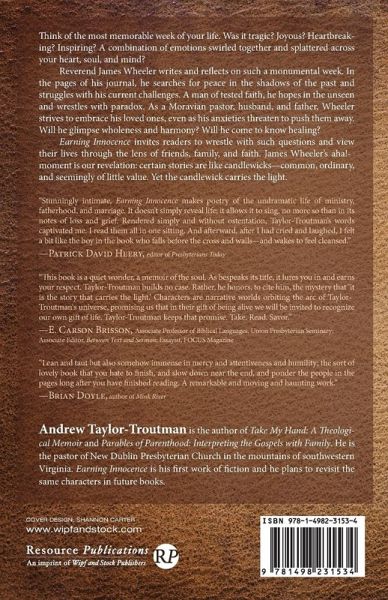 Think of the most memorable week of your life. Was it tragic? Joyous? Heartbreaking? Inspiring? A combination of emotions swirled together and splattered across your heart, soul, and mind? Reverend James Wheeler writes and reflects on such a monumental week. In the pages of his journal, he searches for peace in the shadows of the past and struggles with his current challenges. A man of tested faith, he hopes in the unseen and wrestles with paradox. As a Moravian pastor, husband, and father, Wheeler strives to embrace his loved ones, even as his anxieties threaten to push them away. Will he glimpse wholeness and harmony? Will he come to know healing? Earning Innocence invites readers to wrestle with such questions and view their lives through the lens of friends, family, and faith. James Wheeler's aha!-moment is our revelation: certain stories are like candlewicks--common, ordinary, and seemingly of little value. Yet the candlewick carries the light.