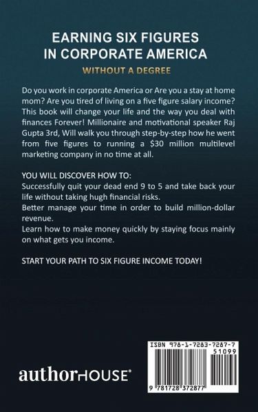 EARNING SIX FIGURES IN CORPORATE AMERICA WITHOUT A DEGREE Do you work in corporate America,or are you a stay at home mom? Are you tired of living on a five figure salary income? This book will change your life and the way you deal with finances forever! Millionaire and motivational speaker Raj Gupta 3rd, will walk you through step-by-step how he went from five figures to running a $30 million multilevel marketing company in no time at all. YOU WILL DISCOVER HOW TO: Successfully quit your dead-end 9 to 5 and take back your life without taking huge financial risks. Better manage your time in order to build a million-dollar revenue. Learn how to make money quickly by staying focus mainly on what gets you income. START YOUR PATH TO SIX FIGURE INCOME TODAY!