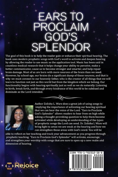 Author Zolisha L. Ware does a great job of using songs to implying the importance of activating our hearing spiritual that we can hear the voice of the Lord. "Ears to Proclaim God's Splendor" allows readers to hear from on high while asking a thought-provoking question to help them become activated while developing an understanding of the types of prophetic songs the Lord can send. Dr. Zolisha L Ware will bring light to areas we are weak at the hearing and how we can strengthen those areas with God's word. You will be able to reflect on her teaching and track your advancement as you progress through prophetic teaching. "Ears to Proclaim God's Splendor" will activate, encourage, and strengthen your worship with songs that are sure to open up a new realm and dimension of hearing.