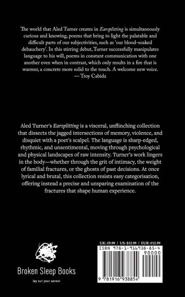 Aled Turner's Earsplitting is a visceral, unflinching collection that dissects the jagged intersections of memory, violence, and disquiet with a poet's scalpel. The language is sharp-edged, rhythmic, and unsentimental, moving through psychological and physical landscapes of raw intensity. Turner's work lingers in the body-whether through the grit of intimacy, the weight of familial fractures, or the ghosts of past decisions. At once lyrical and brutal, this collection resists easy categorisation, offering instead a precise and unsparing examination of the fractures that shape human experience.
