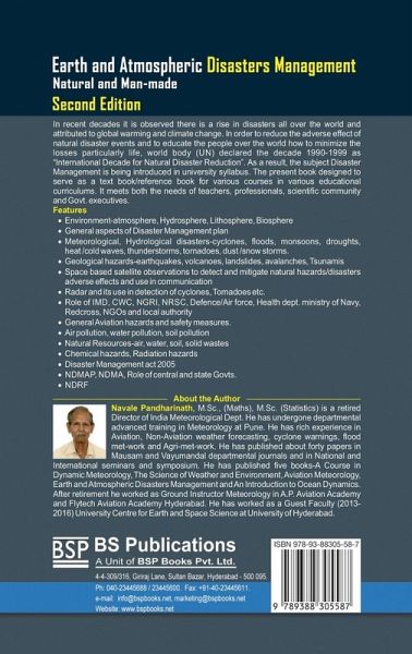 In recent decades, it is observed, there is a rise in disasters all over the world and attributed to global warming and climate change. In order to reduce the adverse effect of natural disaster events and to educate the people over the world how to minimize the losses, particularly life, the world body (UN) declared the decade 1990-1999 as "International Decade for Natural Disaster Reduction". As a result, the subject Disaster Management is being introduced in university syllabus. The present book designed to serve as a textbook/reference book for various courses in various educational curriculums. It meets both the needs of teachers, professionals, scientific community and Govt. executives. Features · Environment-atmosphere, Hydrosphere, Lithosphere, Biosphere · General aspects of Disaster Management plan · Meteorological, Hydrological disasters-cyclones, floods, monsoons, droughts, heat /cold waves, thunderstorms, tornadoes, dust /snow storms. · Geological hazards-earthquakes, volcanoes, landslides, avalanches, Tsunamis · Space based satellite observations to detect and mitigate natural hazards/disasters adverse effects and use in communication · Radar and its use in detection of cyclones, Tornadoes etc. Role of IMD, CWC, NGRI, NRSC, Defence/Air force, Health dept. ministry of Navy, Redcross, NGOs and local authority · General Aviation hazards and safety measures. · Air pollution, water pollution, soil pollution · Natural Resources-air, water, soil, solid wastes · Chemical hazards, Radiation hazards Disaster Management act 2005 NDMAP, NDMA, Role of central and state Govts. NDRF