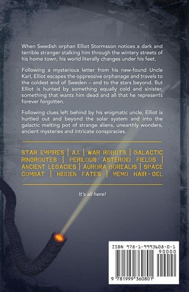 When Swedish orphan Elliot Stormsson notices a dark and terrible stranger stalking him through the wintery streets of his home town, his world literally changes under his feet. Following a mysterious letter from his new-found Uncle Karl, Elliot escapes the oppressive orphanage and travels to the coldest end of Sweden - and to the stars beyond. But Elliot is hunted by something equally cold and sinister, something that wants him dead and all that he represents forever forgotten. Following clues left behind by his enigmatic uncle, Elliot is hurtled out and beyond the solar system and into the galactic melting pot of strange aliens, unearthly wonders, ancient mysteries and intricate conspiracies. Star Empires - A.I. - War Robots - Galactic Ringroutes - Perilous Asteroid Fields - Ancient Legacies - Aurora Borealis - Space Combat - Hidden Fates - Memo Hair Gel It's all here!