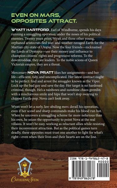 Wyatt Hartford, Earl of Windborne, spends his days running a smuggling operation under the noses of his political enemies. Twenty years prior, Wyatt and three other young, orphaned aristocrats fled war- and weather-ravaged Earth for the Martian city-state of Utopia. Now the four friends-nicknamed the Lords of Dystopia-use their money and influence to champion citizens' rights and progressive reforms. To the downtrodden, they are leaders. To the noble scions of Queen Victoria's empire, they are a threat. Mercenary Nova Pratt likes her assignments-and her life-efficient, tidy, and uncomplicated. Her latest contract ought to be perfect: Find and arrest the smuggler known as the Viper. Lock up the bad guy and save the day. Her target is no hardened criminal, though. He's a rainbows-and-sunshine chaos gremlin with a mischievous smile and hips that won't stop swaying to chipper Earth-pop. Nova can't look away. Wyatt won't let a surly, law-abiding merc derail his operation, even if her scowl and sharp commands make his blood run hot. When he uncovers a smuggling scheme far more nefarious than his own, he seizes the opportunity to point Nova at the real villains. It won't be easy to work as reluctant allies while resisting their inconvenient attraction. But as political games turn deadly, these opposites must trust one another to fight for what's right-by putting their lives and their hearts on the line.