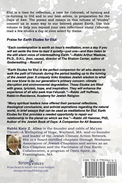 The month of Elul is a time for reflection, a time for t'shuvah, of turning and re-turning to G!d and to our best selves, in preparation for the Days of Awe. It is time for heshbon hanefesh, examining our hearts and souls. Elul is the time for us to begin to make atonement for the things we wish we had or hadn't done, and to renew ourselves, to do all we can to get ourselves to change. Elul is a time to turn away from the ways in which we have missed the mark and to make restitution as needed. To help you on this journey, you will find in this volume a series of reflections for the month of Elul, divrei Earth—teachings that connect Earth and Torah. These poems and essays are "etudes" that remind us that we cannot disconnect ourselves from all that surrounds us and that we are part of an intertwined whole. Use this volume to help you expand your own reflections about t'shuvah: read a few etudes a day or even select by theme. Themes include climate change, community and covenant, cycles, nature, gardening, personal behavior, rituals, and turning. These reflections, meditations filled with Jewish wisdom, are written by rabbis, hazzans, environmentalists, gardeners, activists, educators, storytellers, poets, scientists and other spiritual leaders, reflecting many points of view and ways of looking at the world and the process of t'shuvah. The editor, Rabbi Katy Allen of Ma'yan Tikvah-A Wellspring of Hope, is the co-founder and leader of the Jewish Climate Action Network (JCAN) and the facilitator of the One Earth Collaborative, a program of Open Spirit in Framingham, Massachusetts.