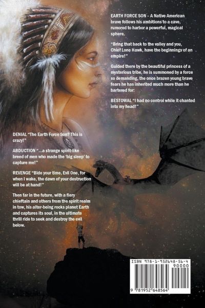EARTH FORCE SON - A Native American brave follows his ambitions to a cave, rumored to harbor a powerful, magical sphere. "Bring that back to the valley and you, Chief Lone Hawk, have the beginnings of an empire!"Guided there by the beautiful princess of a mysterious tribe, he is summoned by a force so demanding, the once brazen young brave fears he has inherited much more than he bartered for:BESTOWAL "I had no control while it chanted into my head!" DENIAL "The Earth Force Son? This is crazy!" ABDUCTION "...a strange spirit-like breed of men who made the 'big sleep' to capture me!" REVENGE "Bide your time, Evil One, for when I wake, the dawn of your destruction will be at hand!" Then far in the future, with a fiery chieftain and others from the spirit realm in tow, his alter-being rocks planet Earth and captures its soul, in the ultimate thrill ride to seek and destroy the evil below.