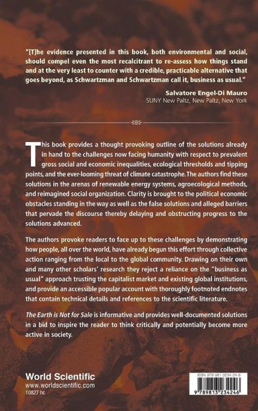 This book provides a thought provoking outline of the solutions already in hand to the challenges now facing humanity with respect to prevalent gross social and economic inequalities, ecological thresholds and tipping points, and the ever-looming threat of climate catastrophe. The authors find these solutions in the arenas of renewable energy systems, agroecological methods, and reimagined social organization. Clarity is brought to the political economic obstacles standing in the way as well as the false solutions and alleged barriers that pervade the discourse thereby delaying and obstructing progress to the solutions advanced. The authors provoke readers to face up to these challenges by demonstrating how people, all over the world, have already begun this effort through collective action ranging from the local to the global community. Drawing on their own and many other scholar's research, they reject a reliance on the "business as usual" approach trusting the capitalist market and existing global institutions, and provide an accessible popular account with thoroughly footnoted endnotes that contain technical details and references to the scientific literature. The Earth is Not for Sale informs its readers and provides well-documented solutions in a bid to inspire readers to think critically, and potentially become more active in society.