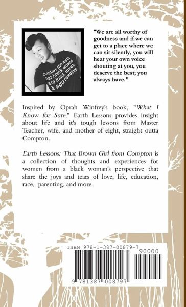 Earth Lessons: That Brown Girl from Compton is a collection of lessons and experiences about life, love, domestic violence, parenting, race, and education from the perspective of wife, mother of eight, and Master Teacher, straight outta Compton.
