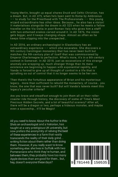 Young Merlin, brought up equal shares Druid and Celtic Christian, has a dream. But, in AD 475, when he's been sent to Rome by Ambrosius - to study for the Priesthood with The Professionals - this young wizard extraordinaire has other ideas. Because... he also has a vision! It materialises alongside the dream in AD 525 when he meets a fellow traveller on the Via Ostia in post-Roman Italy who gives him a staff with two entwined snakes carved around it. In AD 1876, the vision gets bigger, and it keeps changing shape. Almost as often as he keeps time-slipping into the unexpected... In AD 2016, an ordinary archaeologist in Glastonbury has an extraordinary experience -which she excavates. She discovers a 9th-century Carolingian monastery that has never been built but matches the 9th-century plan of itself that was commissioned by Emperor Charlemagne to perfection. What's more, it's in a 6th-century context in Somerset. In AD 2018, just as excavations of this strange anomaly are wrapping up, much stranger things than its mere existence are beginning to happen with exponential rapidity, and Vanda is forced to give up all thought of control in a life that is spiralling so out of control that it no longer seems to be her own. Then there's the fortuitous appearance of Brian and his mysterious legacy... more than sufficient to rebuild the monastery, of course... you know, the one that was never built? But will Vanda's talents meet this legacy's peculiar criteria? Are you brave and steadfast enough to join them all on their roller-coaster ride through history, the discovery of some of Time's Most Precious Hidden Secrets, and a lot of beautiful scenery? After all, there will be a dragon or two, perhaps a hideous monster, and maybe even a spaceship... it'll be Magic!