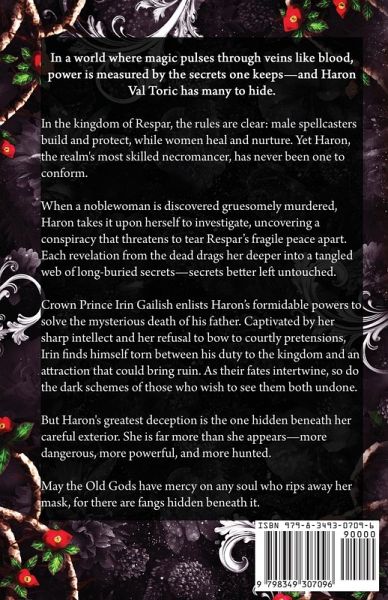 In a world where magic pulses through veins like blood, power is measured by the secrets one keeps-and Haron Val Toric has many to hide. In the kingdom of Respar, the rules are clear: male spellcasters build and protect, while women heal and nurture. Yet Haron, the realm's most skilled necromancer, has never been one to conform. When a noblewoman is discovered gruesomely murdered, Haron takes it upon herself to investigate, uncovering a conspiracy that threatens to tear Respar's fragile peace apart. Each revelation from the dead drags her deeper into a tangled web of long-buried secrets-secrets better left untouched. Crown Prince Irin Gailish enlists Haron's formidable powers to solve the mysterious death of his father. Captivated by her sharp intellect and her refusal to bow to courtly pretensions, Irin finds himself torn between his duty to the kingdom and an attraction that could bring ruin. As their fates intertwine, so do the dark schemes of those who wish to see them both undone. But Haron's greatest deception is the one hidden beneath her careful exterior. She is far more than she appears-more dangerous, more powerful, and more hunted. May the Old Gods have mercy on any soul who rips away her mask, for there are fangs hidden beneath it.