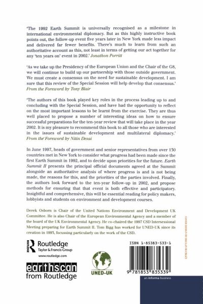 In June 1997, heads of government and senior representatives from over 130 countries met in New York to consider what progress had been made since the first Earth Summit in 1992, and la decide upon priorities for the future. Earth Summit II presents the principal official documents agreed al the Summit alongside an authoritative analysis of where progress is and is not being made, the reasons for this, and the priorities of the parties involved. Finally, the authors look forward to the ten-year follow-up in 2002, and propose methods for ensuring that that event is both effective and participatory. Insightful and comprehensive, this will be essential reading for policy makers, lobbyists and students on environment and development courses.